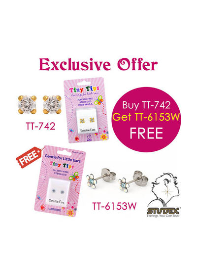 Studex : 2 جفت گوشواره میخی زیرکونیا تیفانی مکعبی با روکش طلا و استیل