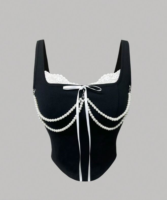 پاپیون و زنجیر تزئینی: پاپیون و زنجیرهای تزئینی به طراحی این تاپ جلوهای خاص و مدرن میبخشند.
