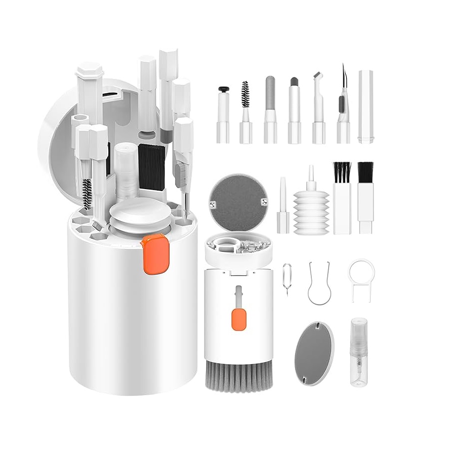 【Multi-purpose Cleaning Kit】Electronic cleaning kit includes cleaning pen with metal tip, sponge brush, mini soft brush, round brush, keyboard brush, keycap puller, switch puller, spray bottle, fiber fleece swipe, air blower with long and short nozzles, lens cleaning pen with soft pad, hard bristled brush and soft-bristled brush, and a card remover. The cleaner kit can efficiently clean laptops, keyboards, headphones, screens, phones, etc.