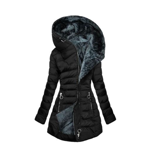 یک کت یا ژاکت زنانه مناسب زمستان، طراحی شده برای گرمای بیشتر، با مشخصاتی مثل: